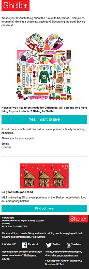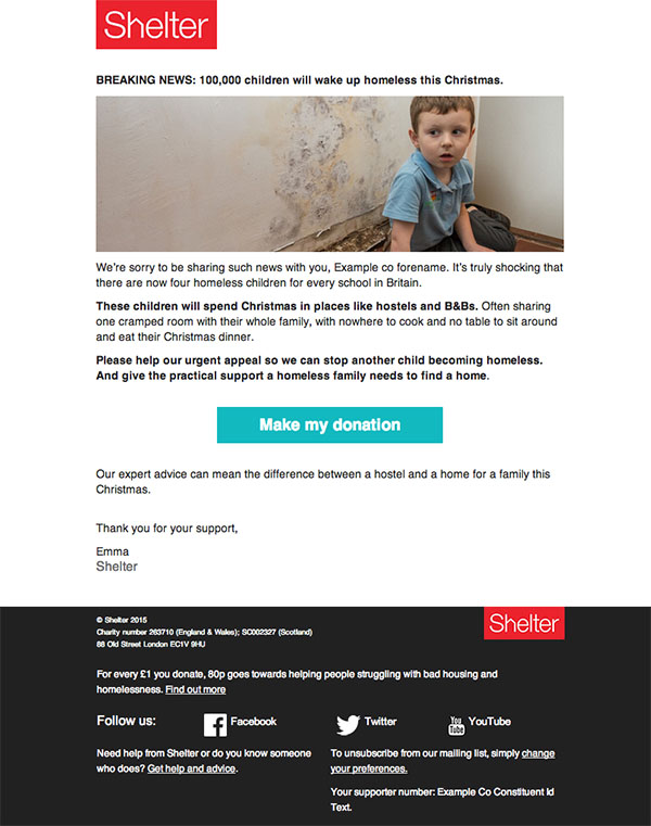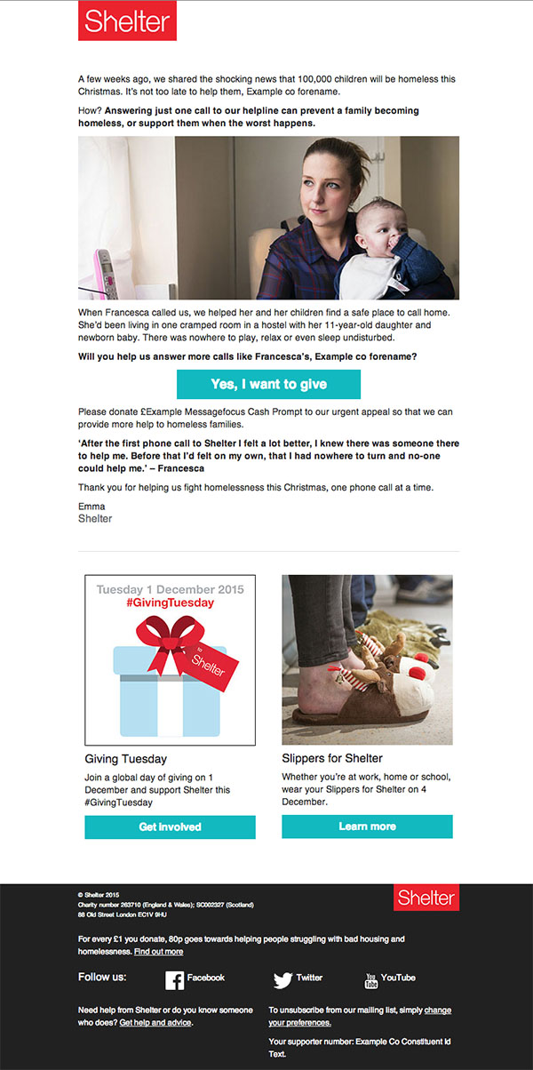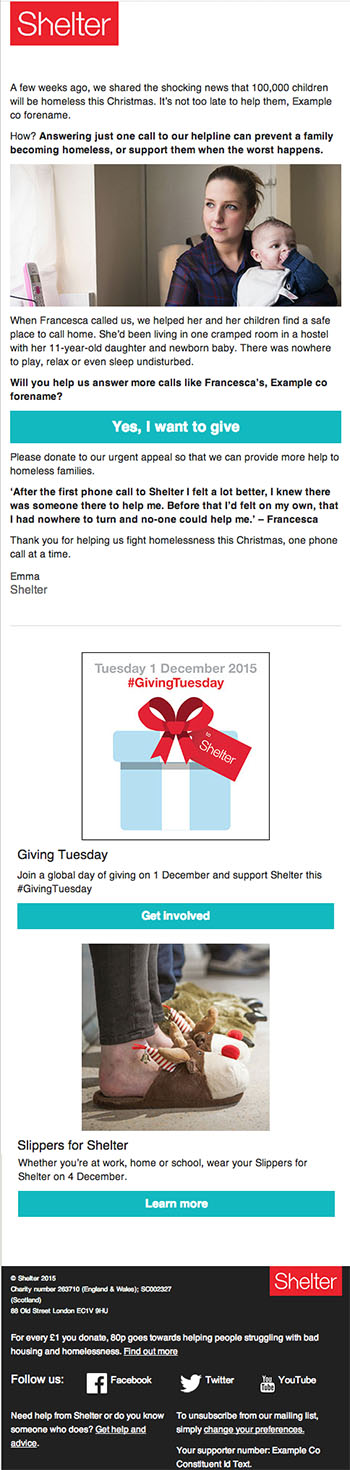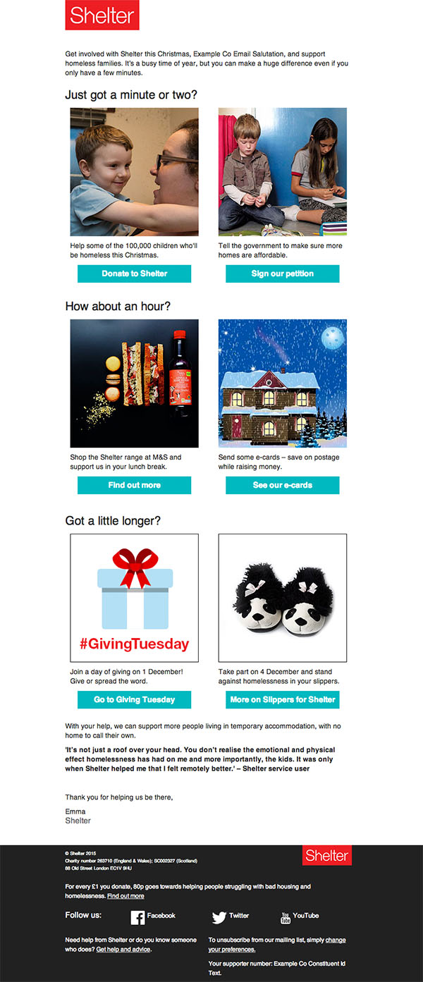 Instigated email template re-design to ensure Shelter’s emails were mobile optimised. Developed modular designs for flexibility in content strategy and a clear hero and secondary messaging hierarchy.