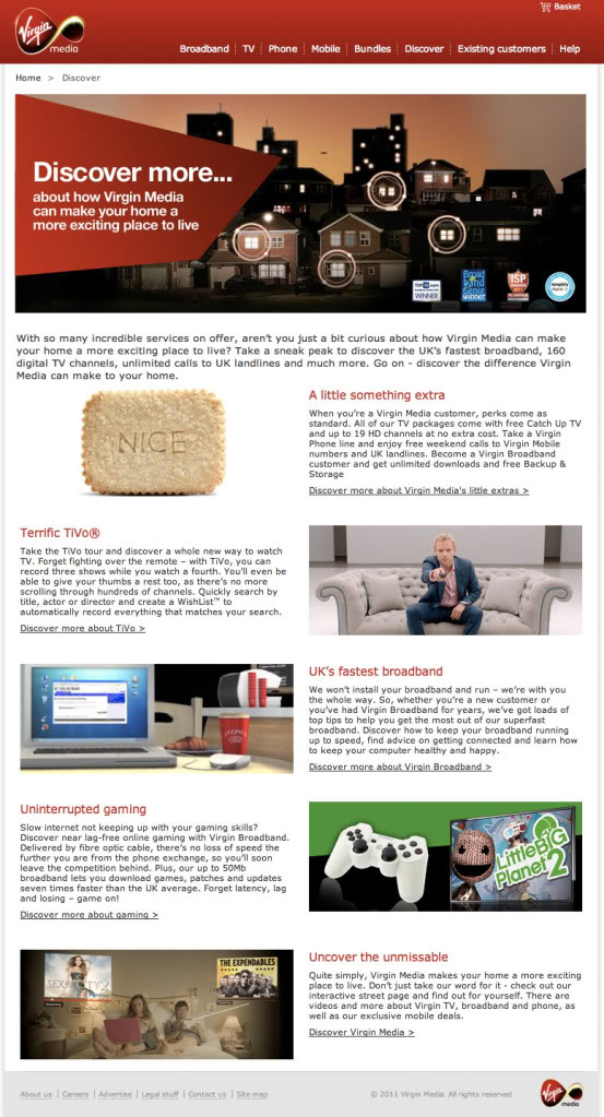 Copy demonstrating Virgin Media’s services . Providing tangible, tantalising reasons to sign up to a package.